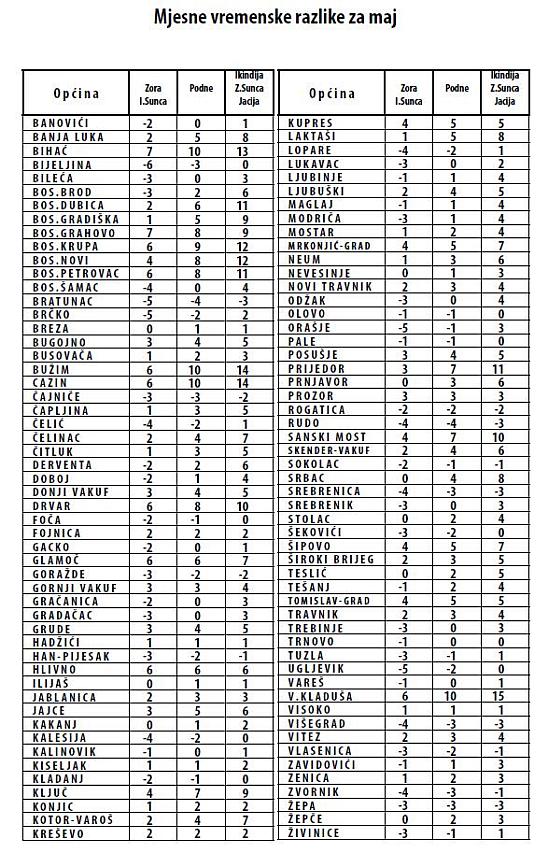 Za vremenske razlike po gradovima u Bosni i Hercegovini za mjesec april kliknite ovdje i za mjesec maj kliknite ovdje.